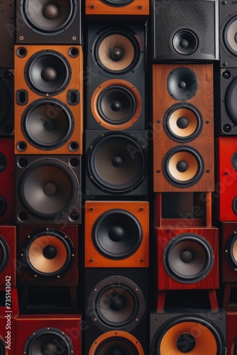 A bunch of speakers stacked on top of each other. Suitable for music events, concerts, audio technology articles, and sound system advertisements