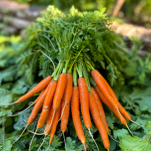 A bunch of vibrant carrots displayed against a backdrop of lush green foliage in a sun-drenched garden, showcasing the beauty of nature's bounty.