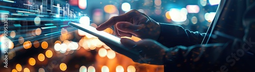 A business professional interacts with a smartphone against a backdrop of city lights, illustrating connectivity and modern technology..