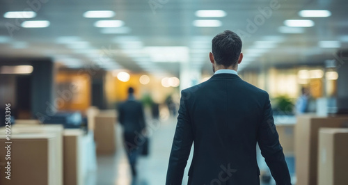 businessman, office, hallway, corridor, suit, walking, work, day, late, professional, career, corporate, employee, men at work, business, modern, building, interior, architecture, environment, transportation, briefcase, bag, carrying, man, person, male, step, floor, lighting, muted, tone, atmosphere, mood, scene, view, perspective, back, rear, dark, sombre, quiet, end