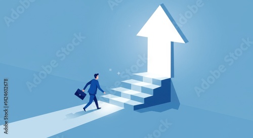 man, suit, stair, arrow, opening, background, art, blue, walking, briefcase, step, light, shadow, path, direction, career, success, growth, future, goal, achievement, way, forward, business, leader, climb, vision, opportunity, motivation, progress