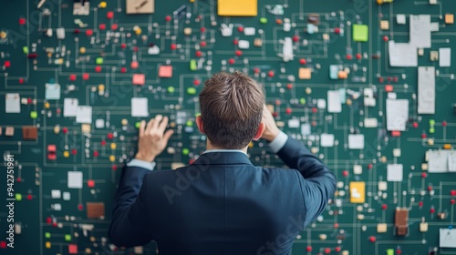 A businessman stands in front of a wall covered in sticky notes, analyzing data and planning a strategy.