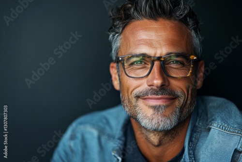 A businessman wearing eyeglasses and smiling is the subject of a studio portrait with a dark background