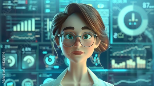 A businesswoman girl in a 3D cartoon style on the background of graphs and diagrams. Presentation concept.