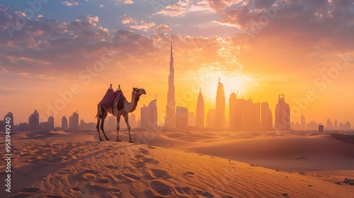 desert, camel, sand, dune, sunset, city, skyline, modern, architecture, travel, sky, cloud, gold, sunrise, city landscape, landscape, horizon, nature, animal, wildlife, sun, light, warm, day, afternoon, evening, dusk, ray, hot, dry, huge, heat, adventure, journey, exotic, vacation, emirate, building, skyscraper, twilight, silhouette, environment, arab, arabia, middle east, culture, tradition, mammal
