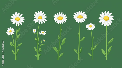 A camomile icon set featuring white daisy chamomile flowers in a cute round design, isolated on a green background, perfect for love card symbols.