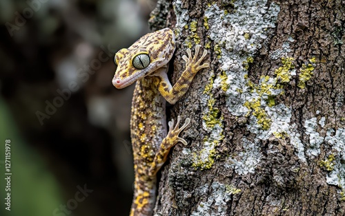 A camouflaged gecko hiding on a tree trunk