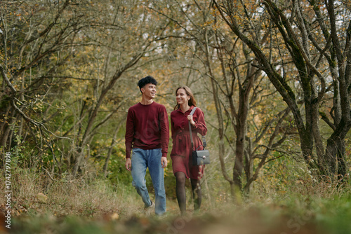 authenticity, truthful, genuine, natural, forest, pathway, couple, walking, stroll, outdoors, sunlit, light, warmth, smile, connection, emotion, mood, tranquil, peaceful, companionship, together, intimate, candid, scene, realism, moment, nature, breeze, tree, leaf, path, calm, serene, quiet, relaxed, attire, gesture, gaze, harmony, bond, narrative, journey, support, trust, authentic