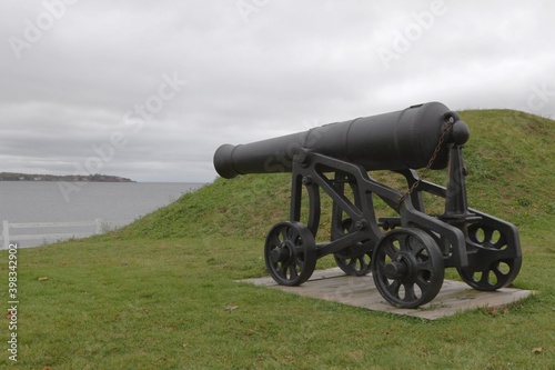 A cannon stands guard over Charlottetown Harbour from Prince Edward Battery in PEI.