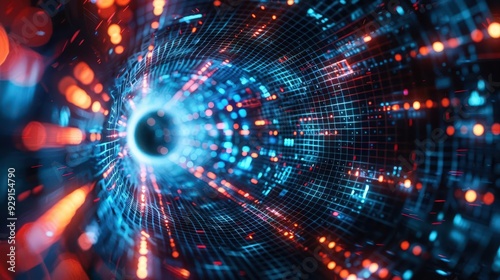 A captivating abstract digital tunnel showcasing vibrant blue and orange lights, conveying a sense of depth and motion.