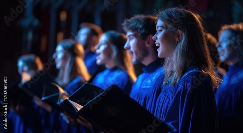 choir, singing, performance, concert, music, vocal, group, harmony, song, anthem, choral, melody, rythm, symphony, orchestra, stage, audience, spotlight, musician, artist, people, woman, man, youth, young, adult, blue, robe, book, score, sheet, note, light, dark, indoor, event, cultural, expression, passion, emotion, togetherness
