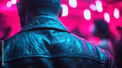 man, nightlife, club, leather, neon, mystery, allure, modern, aesthetic, emotion, style, deep, vibrant, urban, energy, bright, artistic, fashion, entertainment, ambience, intimacy, celebration, social, design, character, lighting, perspective, depth, excitement, contrast, visual, intrigue, city, people, trendy, beauty, shadow, colours, tone, atmosphere