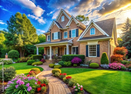 landscaping, lawn, tree, architectural style, lush green, plant, flower, sunlight, warm light, garden design, home decor, home improvement, photo, art, design, beauty, inspiration, aesthetic, digital artwork