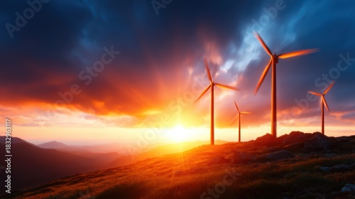 sunrise, energy, nature, artistic, renewable, beauty, sustainable, sustainability, green, environmentally friendly, landscape, technology, environment, electricity, wind power, dawn, high-coloured, harmony, clean, sky, innovation, breathtaking, environmental, clean energy, scenic, wind farm, fresh air, modern, tranquil, rural, atmospheric, photo, aesthetic, inspiring, scenic beauty, earth, 2023, digital artwork