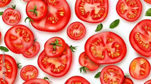 A Captivating Visual Feast of Sliced Tomatoes: A Vibrant and Realistic Display of Freshly Cut Tomatoes, Perfect for Culinary Inspiration or Food-Themed Designs.