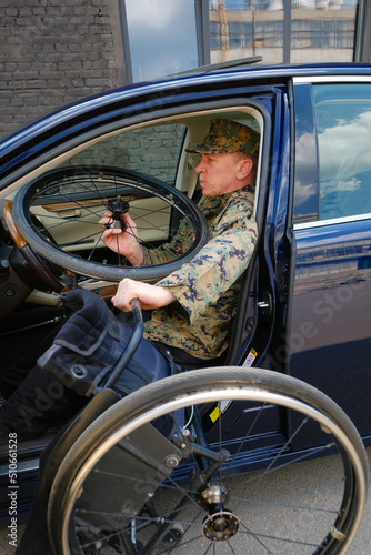 a car driver in military uniform holds a wheel from a wheelchair in his hand and takes it out of the car