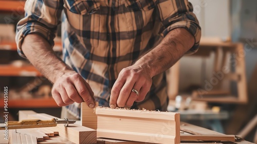 A carpenter carefully aligns a piece of wood with a tool in his workshop.