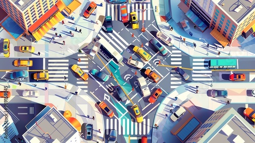 city, street, intersection, traffic, car, vehicle, urban, transportation, tied-up, crowded, crosswalk, pedestrian, building, architecture, art, illustration, design