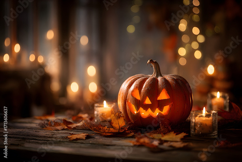 A carved pumpkin with a glowing face sits on a wooden table, surrounded by lit candles and scattered autumn leaves