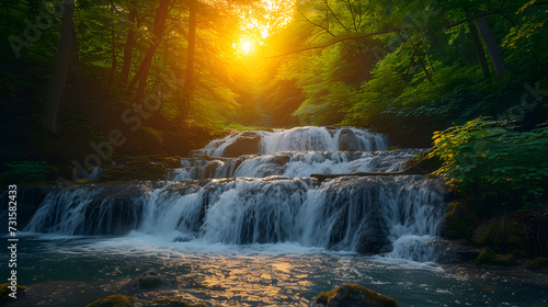A cascading waterfall, with lush greenery as the background, during a vibrant sunset