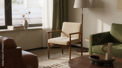 minimalist, comfortable, elegant, indoor, bright, soft, chair, furniture, wooden, frame, fabric, beige, armrest, backrest, leg, space, home, decoration, plant, vase, shelf, quiet, warm, life, scene, design, beautiful, practical