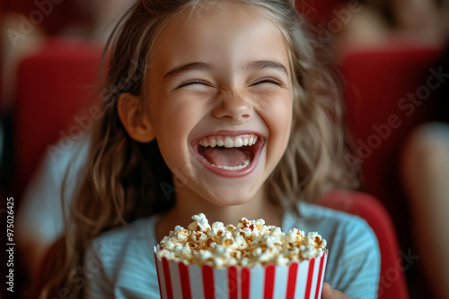 A Caucasian teenage girl, cheerful and lively, enjoying popcorn while laughing at a comedy movie in the cinema. Her bright smile and laughter fill the room.
