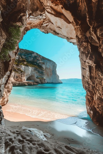 a cave with a beach and a rock formation with a beach in the background