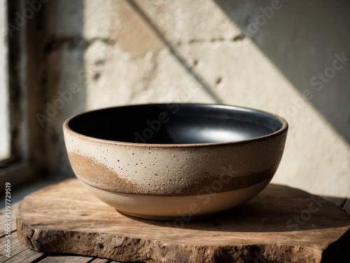 A ceramic bowl with a speckled beige and brown exterior and a black interior sits on a wooden surface, illuminated by natural light from a nearby window, creating a rustic and cozy atmosphere.