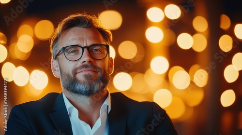 A charismatic man wearing glasses smiles confidently amidst a backdrop of warm bokeh lights, radiating positive energy and self-assuredness in a vibrant environment.