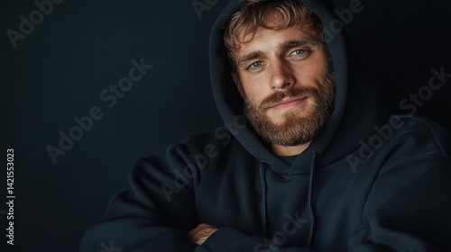 man, beard, smile, hoodie, warmth, charme, relaxed, black, personality, confidence, intimate, photo, beauty, emotion, approachable, modern, casual attire, style, lifestyle, authenticity, character, portrait, candid, joy, comfort, everyday, sophisticated, fashion, casual clothes, connection, emotional, positive, expression, depth, engaging, individuality, young, contemporary, portraiture, dark