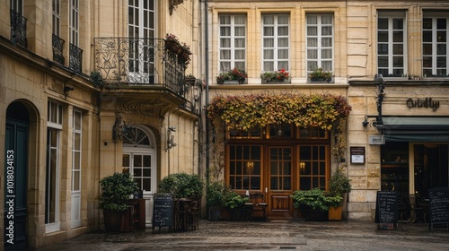A charming European hotel with classic design, no people. Plenty of copy space on the street in front.