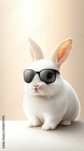 A charming little white rabbit, sporting sunglasses, strikes a fashionable pose for a stylish portrait illuminated by soft, warm lighting