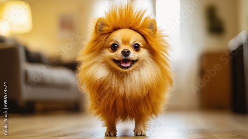pomeranian, lion, costume, dog, fluffy, fur, pet, indoor, cute, playful, small, animal, cosy, day, time, adorable, furry, happy, smiling, companion, fun, lovable, orange, hair, cheerful, tiny, sweet, tail, home, decoration, light, warmth, demeanor, yellow, personality, joy, character, family, grooming, dressing, lover, puppy, play, attire, mane, accessory, whimsical, imaginative