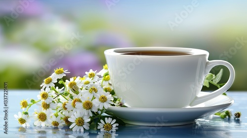 A charming scene features a hot cup of herbal tea in a teal vintage mug, placed on a weathered wooden table surrounded by fresh chamomile blooms. Gentle natural light highlights the floral accents
