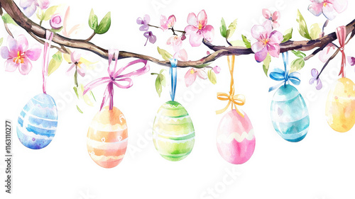 watercolor, easter egg, hanging, tree branch, ribbon, spring, blossom, pastel, festive, nature, delicate, artistic, whimsical, floral, gentle, bright, airy, serene, detailed, hand-painted, countryside, charming, vibrant, dreamy, peaceful, joyful, elegant, expressive, calm, scenic, fresh, seasonal, decorative, celebration, illustration, picturesque, nostalgia, tender, warm tones, intricate, ornamental, renewal
