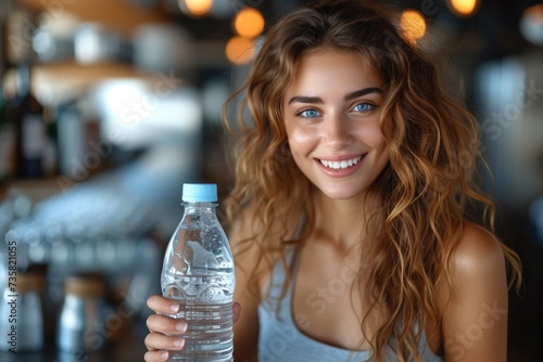 A cheerful and sporty young woman at the gym counter, holding a water bottle, promoting fitness and hydration.