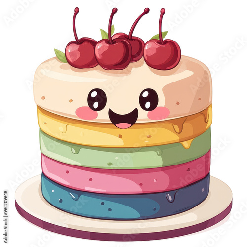 A cheerful animated cake with colorful layers and cherries on top, perfect for celebrations and dessert-themed designs.