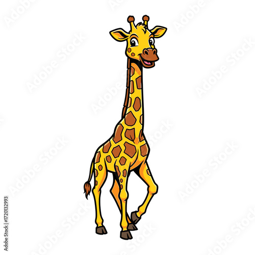 A cheerful cartoon giraffe with a long neck and spotted fur, smiling and walking forward on a white background.