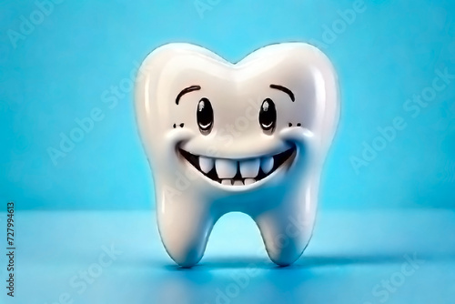 A cheerful cartoon tooth 3D with a big smile and sparkling eyes, set against a vibrant blue background. Ideal for dental care and oral hygiene advertisements or educational materials.