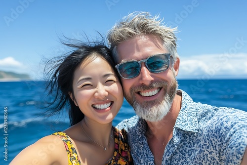 A cheerful Caucasian man and a smiling Asian woman are joyfully posed against the backdrop of a shimmering ocean.