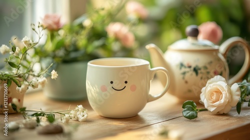 cup, smile, tea, teapot, flower, nature, wood, cosy, drink, happiness, decor, home, relaxation, warmth, setting, aesthetic, joy, beverage, arrangement, greenery, rose, flower petals, morning, sunlight, ceramic, cute, design, calmness, comfort, lifestyle, table, plant, bloom, garden, beauty, simplicity, refreshment, floral, soft, inviting, peaceful, scene, charme, atmosphere, enjoyment, gathering, peacefulness, essence