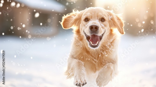 A cheerful golden retriever captured mid-run in a snowy wonderland, showcasing the pure joy and excitement of playful moments in a serene winter environment.