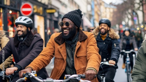 A cheerful group of friends cycles together through a bustling urban area on a winter afternoon