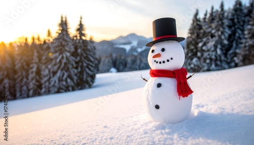 A cheerful snowman stands proudly amidst a snow-covered landscape. The winter scene showcases snow-laden trees, a red scarf, and a classic black top hat