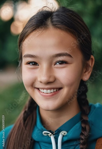 girl, smiling, happy, youthful, afternoon, coiffure, portrait, cheerful, nature, park, facial expression, joy, innocence, youth, carefree, beauty, casual clothes, friendly, vibrant, warmth, confidence, playfulness, candid, relaxed, excitement, style, fashion, personality, expression, laughter, lifestyle, engagement, young, long, hair, warm, happiness, pretty, brunette, resident, kazakhstan, generative, ai, female, smile, teeth, schoolgirl