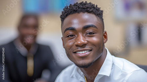 A cheerful young man beams with confidence, showcasing a bright smile while seated in a well-lit environment with a soft background