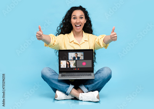 woman, lady, young, caucasian, european, diverse, free space, arab, copy space, excited, application, technology, middle eastern, website, communication, screen, online, contraption, advertisement, promo, group, offer, studio, cyberspace, collage, meeting, company, study, work, laptop, computer, digital, international, people, emotion, blog, background, conference, head shot, blue, video, call, smiling, thumb up, sitting, virtual
