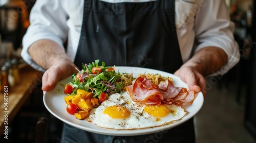 A chef is holding a plate with a breakfast meal consisting of eggs, bacon