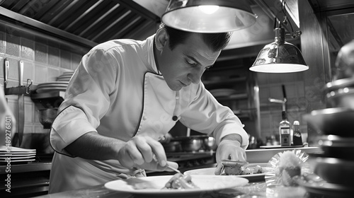 A chef meticulously plates food in a restaurant kitchen under bright lighting in black and white style .