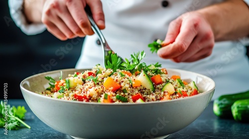 A chef prepares a colorful quinoa salad, mixing fresh vegetables and herbs in a large bowl, showcasing healthy cooking.